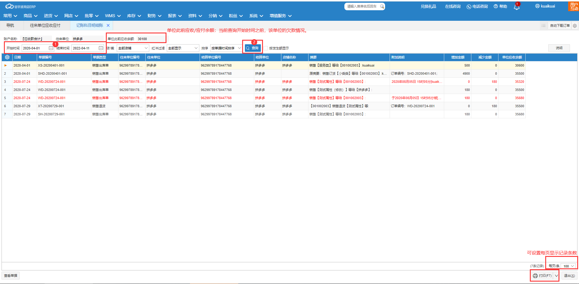 注意:应收应付明细查询目前仅支持当前选中的单个往来单位进行查询,暂不支持批量查询多个或所有客户的应收应付明细。